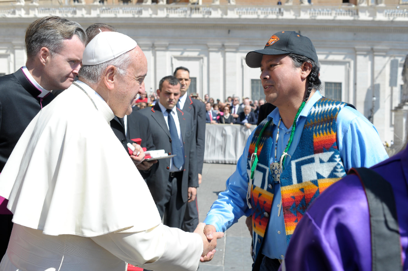 The Long March to Rome is a dissemination event of the NWO WOTRO (Netherlands Organisation for Scientific Research) Research programme “Development as a Trojan Horse? Foreign Large-scale Land Acquisitions in Ethiopia, Kenya, Madagascar, Senegal and Uganda” (director dr Sandra J.T.M. Evers). The Long March to Rome was born of a series of discussions held between Dr David Close, Dr Sandra Evers and David J. MacKinnon in Vancouver British Columbia during early Spring, 2014. Further discussions and meetings with numerous hereditary chiefs, elders and interveners representing First Nations groups in Canada and the United States led to a growing consensus that a petition should be presented to Pope Francis I, asking that he revoke the two papal bulls Romanus Pontifex (1455) and Inter Caetera (1493) as contrary to modern international law, and as violations of the basic human rights of aboriginal peoples worldwide. On 30 April 2016 and 1 May, indigenous leaders held a Gathering of Nations in Florence and from there went on to meet on 4 May with Pope Frances I and a high commission of the Vatican for the first time in over 500 years to discuss the revocation of the papal bulls.